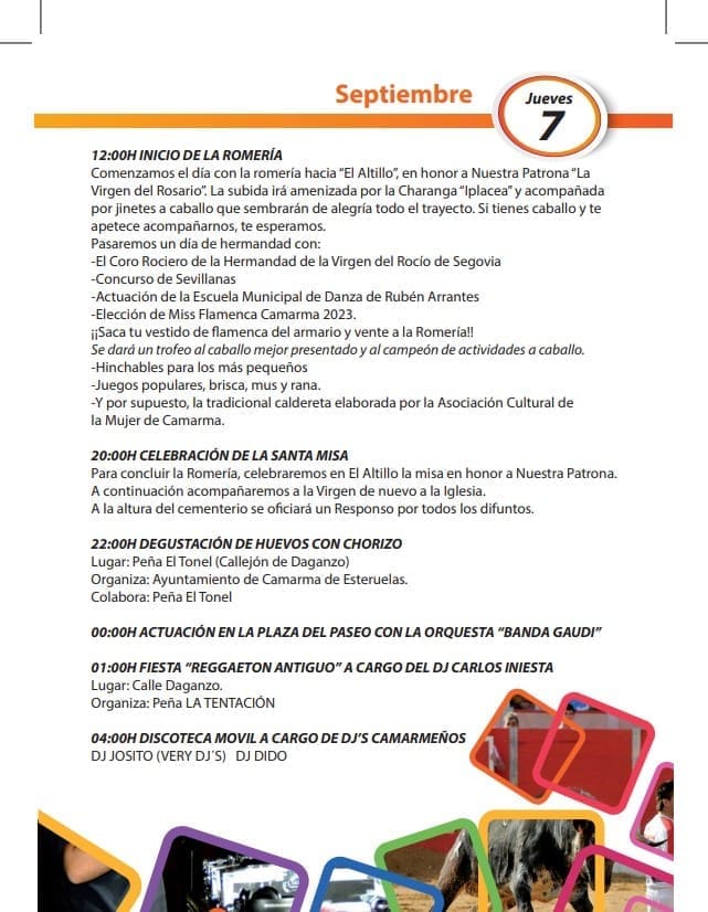 MADRID – CAMARMA DE ESTERUELAS FIESTAS CAMARMA DE ESTERUELAS 2023 Última modificación: 5 de septiembre de 2023 Fecha 07 Sep 2023, jueves ¡Caducado! Hora Todo el día Compartir este evento