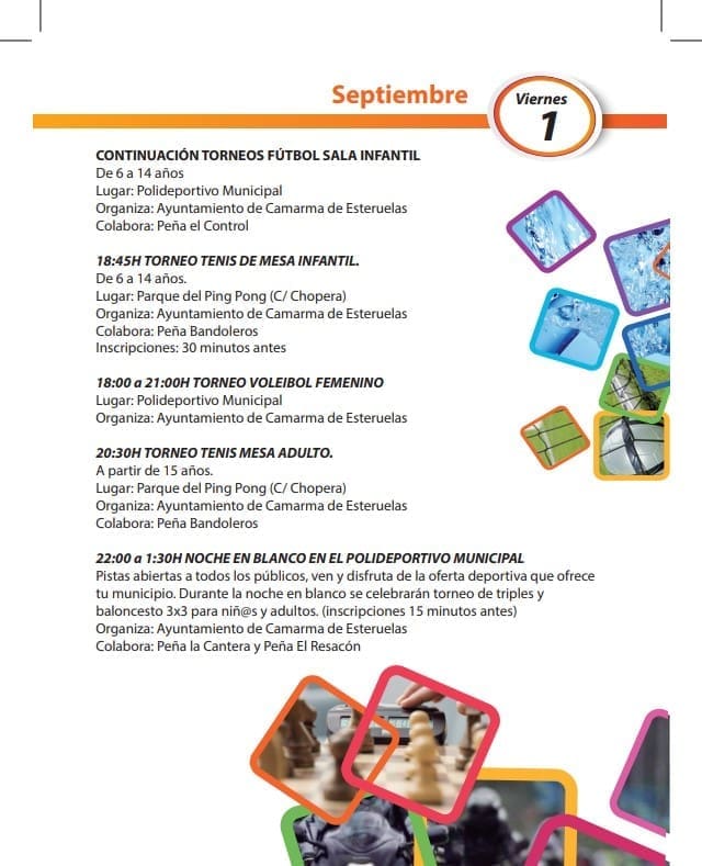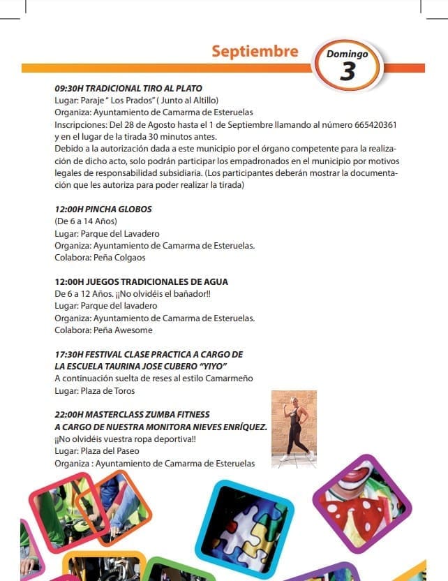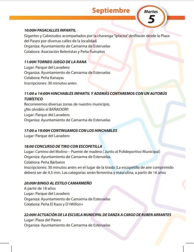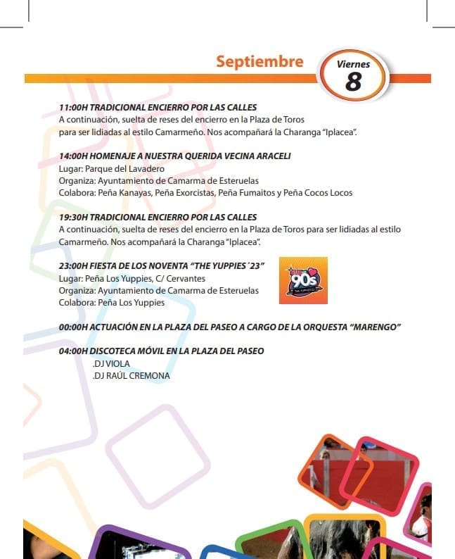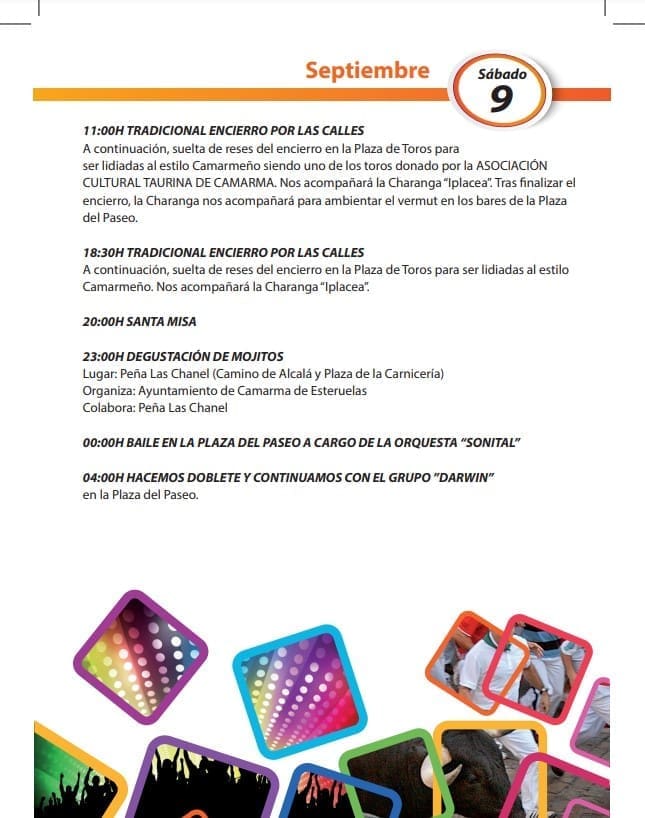 FIESTAS CAMARMA DE ESTERUELAS (MADRID) 2023 FIESTAS CAMARMA DE ESTERUELAS 2023Autor de la entrada:Banda GaudíPublicación de la entrada:4 de septiembre de 2023Categoría de la entrada:programación de fiestasComentarios de la entrada:Sin comentarios Si te ha gustado, ¡Comparte! Compartir este contenido Se abre en una nueva ventana Se abre en una nueva ventana Se abre en una nueva ventana FIESTAS CAMARMA 2023 FIESTAS CAMARMA DE ESTERUELAS 2023Última modificación: 5 de septiembre de 2023 Si te ha gustado, ¡Comparte! Compartir este contenido Se abre en una nueva ventana Se abre en una nueva ventana Se abre en una nueva ventana Leer más artículos Entrada anteriorFIESTAS SANTA MARÍA DEL PÁRAMO 2023, DEL 1 AL 10 DE SEPTIEMBRE Siguiente entradaFIESTAS BALTANÁS (Palencia) 2023 También podría gustarte FIESTAS GOIÁN (PONTEVEDRA) DEL 1 AL 9 DE JULIO DE 20234 de julio de 2023 FIESTAS DE SAN PEDRO EN SOBARZO (CANTABRIA) SÁBADO 25 Y DOMINGO 26 DE JUNIO24 de junio de 2022 FIESTAS EN TREVÍAS (ASTURIAS ) 2023, 29 Y 30 SEPTIEMBRE Y 1 DE OCTUBRE29 de septiembre de 2022Deja una respuesta Cancelar la respuestaComentarioIntroduce tu nombre o nombre de usuario para comentarIntroduce tu dirección de correo electrónico para comentarIntroduce la URL de tu web (opcional) Guarda mi nombre, correo electrónico y web en este navegador para la próxima vez que comente.